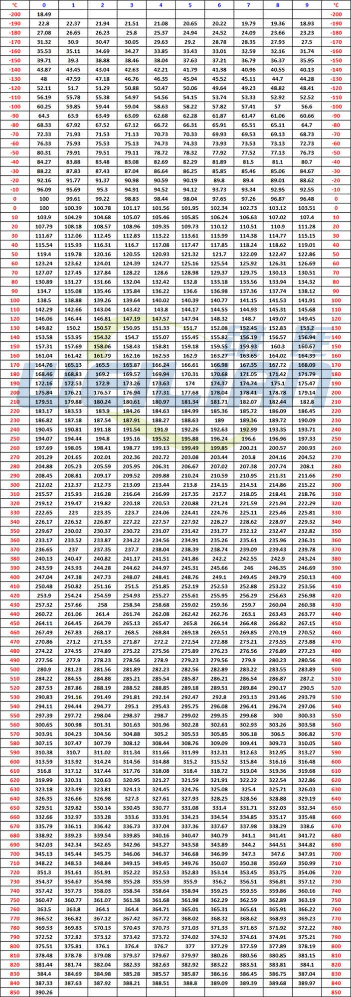 Pt100溫度傳感器的溫度與電阻對(duì)照表(分度表)