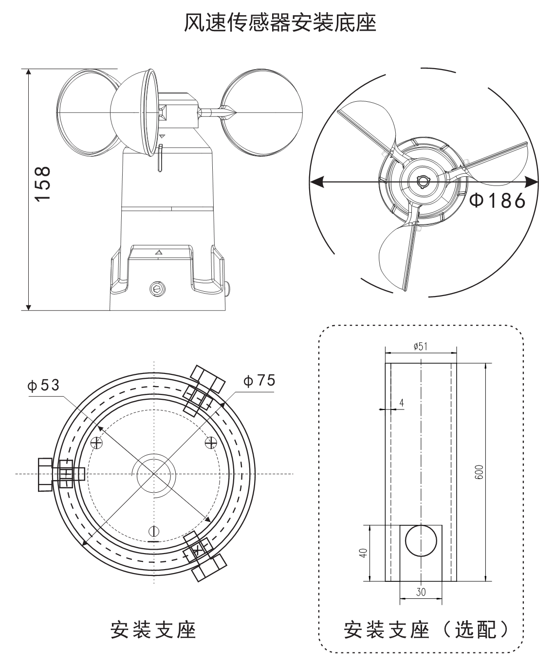 采用法蘭安裝,螺紋法蘭連接使風(fēng)速傳感器下部管件牢牢固定在法蘭盤(pán)上,底盤(pán)的圓周上開(kāi)四個(gè)的